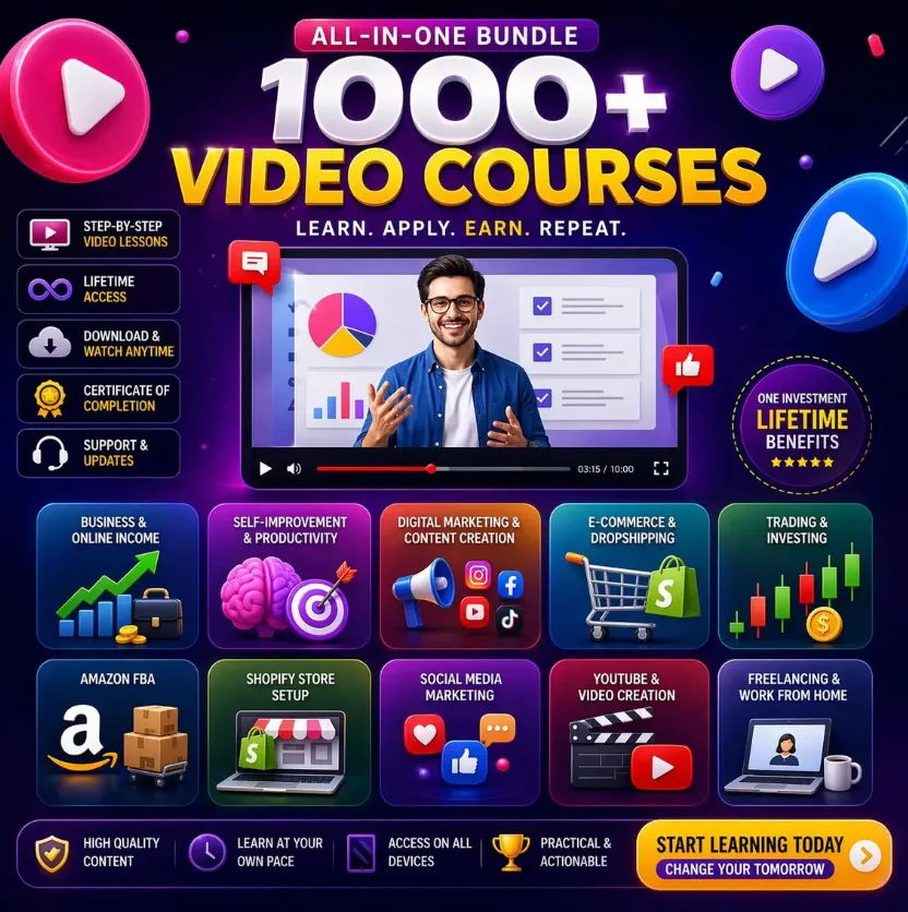 Marketing & Business Training: 1,600+ courses on social media growth, content strategy, AI tools, traffic generation, and monetization systems.